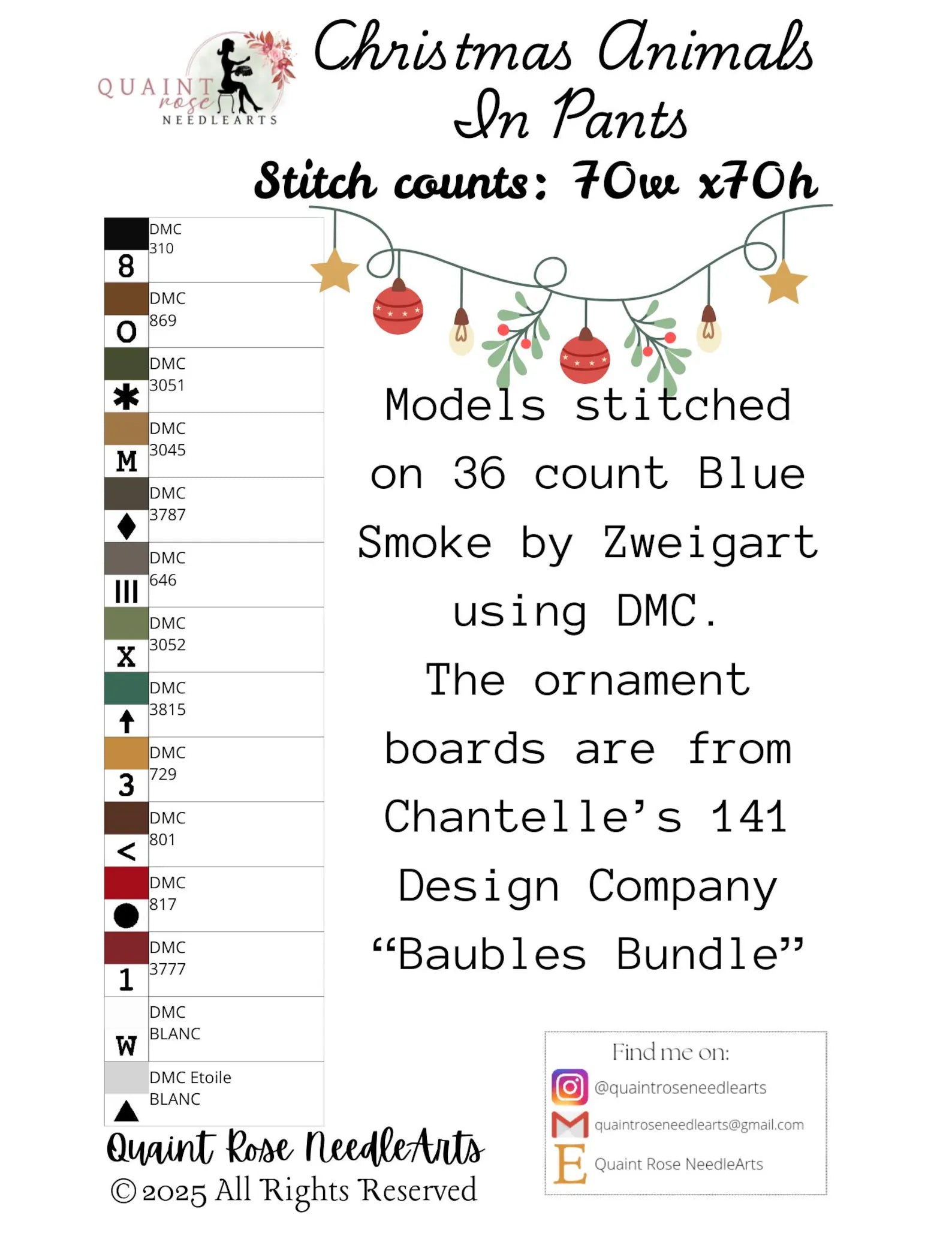 Christmas Animals in Pants Cross Stitch Pattern by Quaint Rose Needlearts