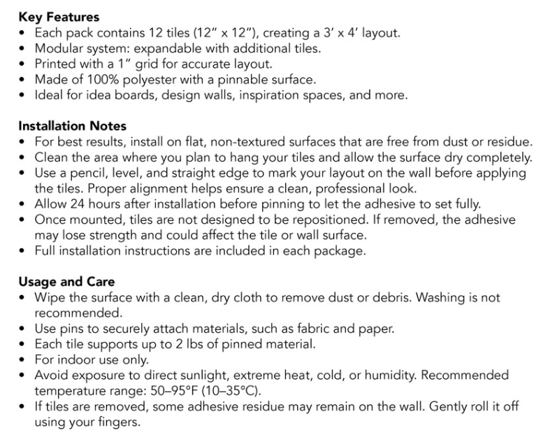 Designed for long-term placement, the tiles adhere securely to smooth surfaces and are not intended to be removed and reapplied. Ideal for quilters, crafters, and artists, this system turns any smooth wall into a stylish and functional creative workspace.