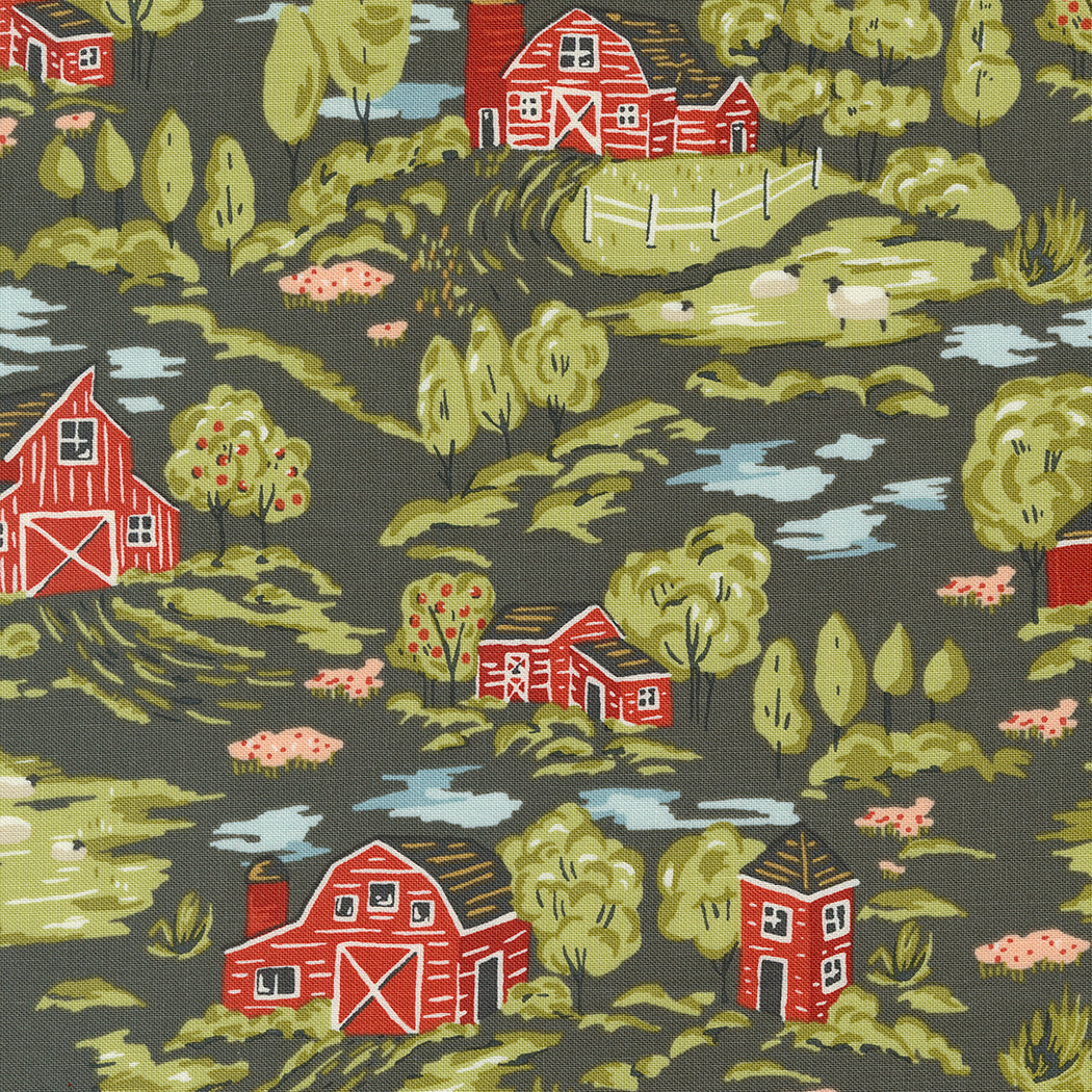 Farmstead Vintage Farm Scene Charcoal M2090116 by Stacy Iest Hsu for Moda fabrics (sold in 25cm increments)
