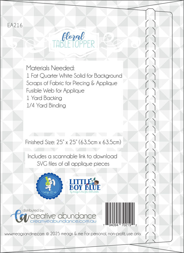 This Floral Tabbletopper by Meags and Me is designed to be a table runner or small quilt and utilises Meags and Me's latest Fabric range Little Boy Blue.