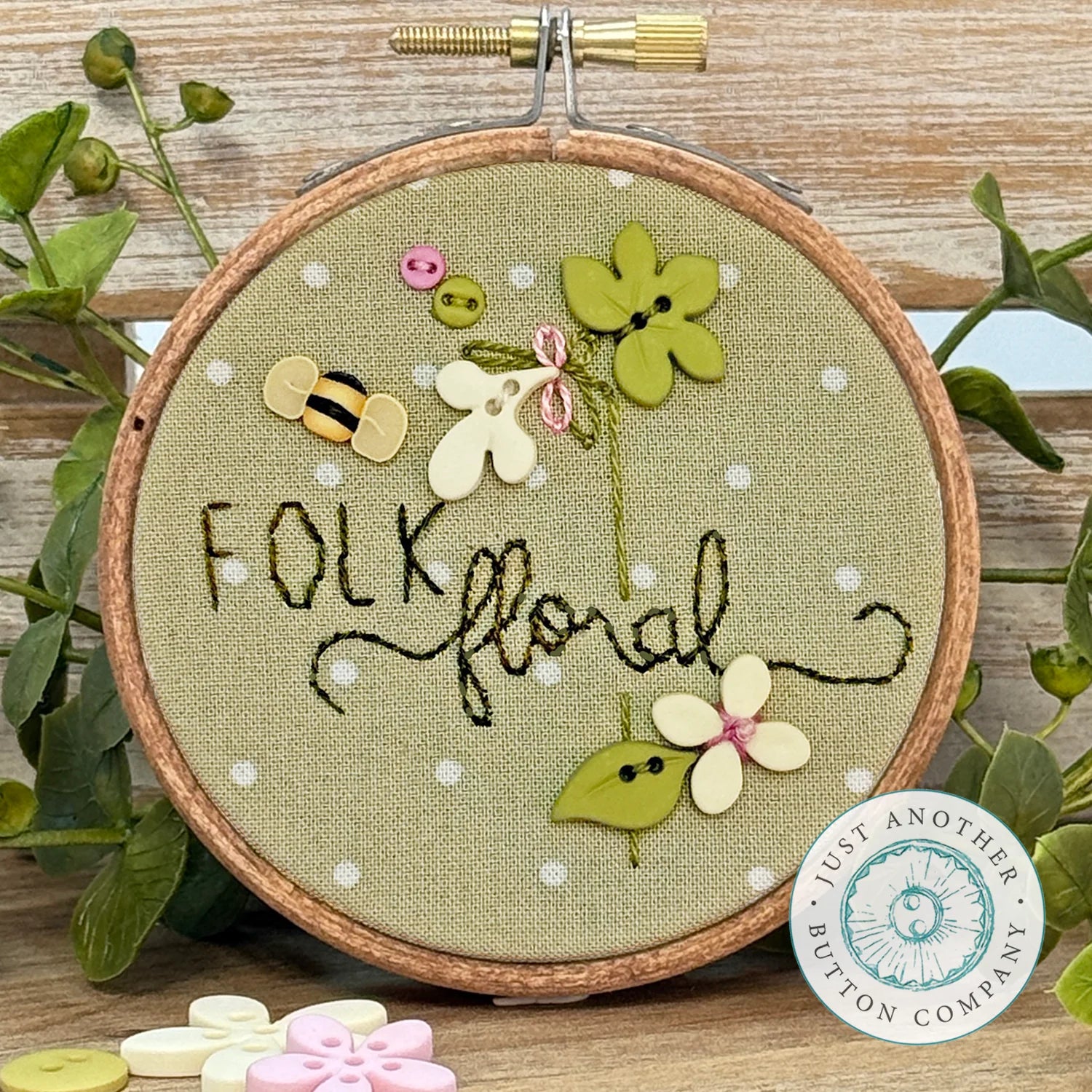 Folk Garden Buttons: Honeysuckle by Just Another Button Company includes the 7 buttons shown in the photo. These hand-dyed and handmade clay buttons can be used to finish any needlework project. Free instructions are also included to complete the project shown, finished in a 3" embroidery hoop. You provide the fabric, floss and hoop.