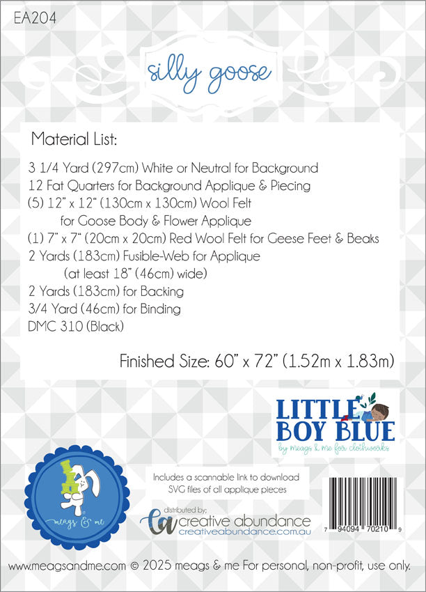 Silly Goose by Meags and Me is a whimsical appliquéd Goose themed quilt that utilises Meags and Me's latest Fabric range Little Boy Blue