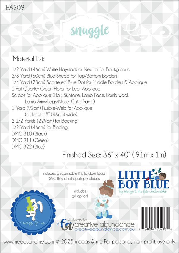 Snuggle by Meags and Me is a snuggly themed quilt that utilises Meags and Me's latest Fabric range Little Boy Blue. Applique includes both boy or girl options.