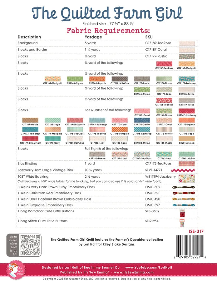 The Quilted Farm Girl Cross Stitch Pattern comes with full-color instructions, diagrams and supply list, including suggested Classic Colorworks and DMC floss. It is printed on durable 8.5" x 11" cardstock. The cross stitch is designed to work on 25 count Lugana and finishes at 12.375" x 14".